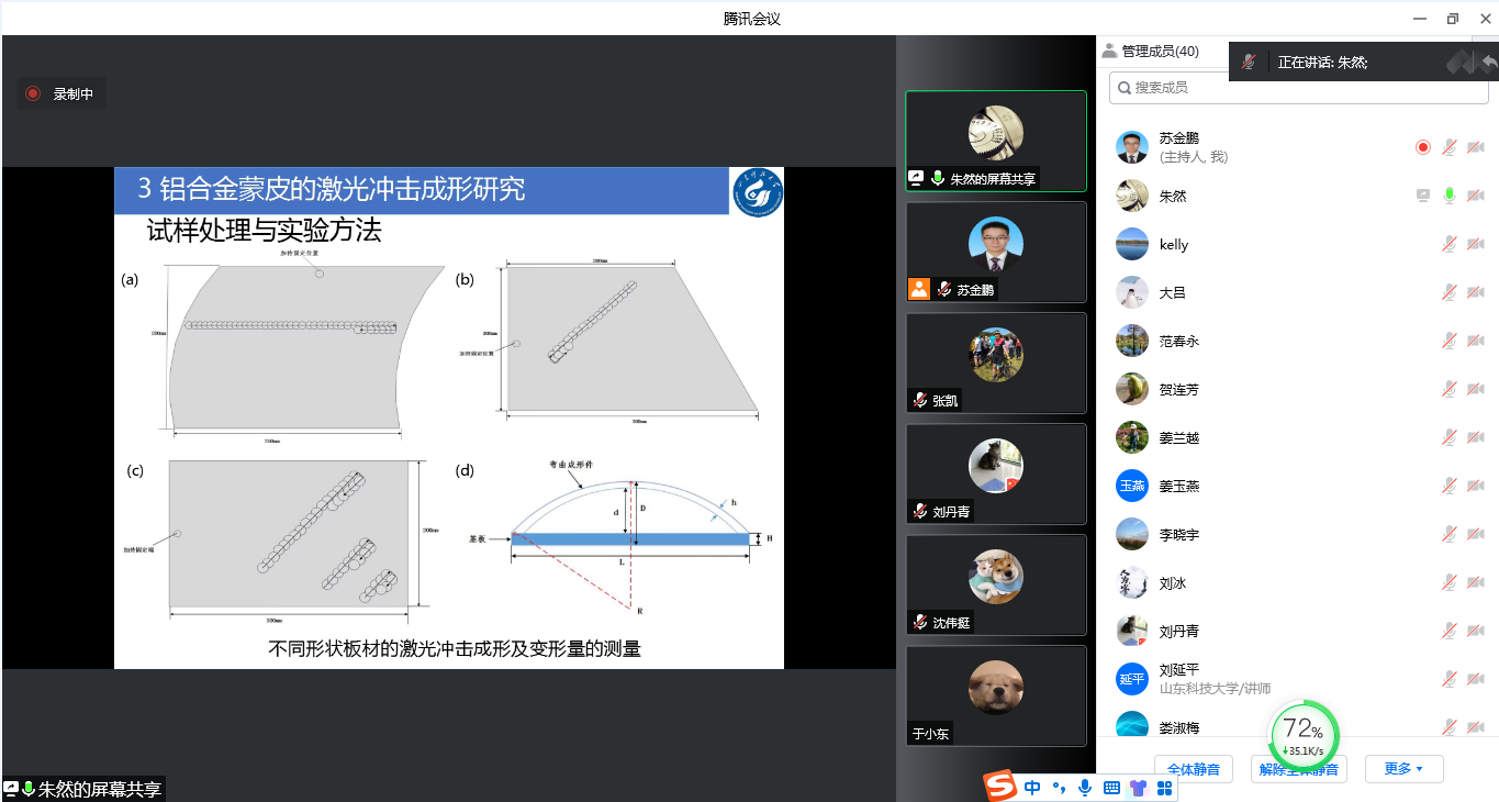 然后,会议进入第一阶段引导报告。张凯博士就“先进弹塑性损伤本构建模及其在塑性成形中的应用”进行报告。他首先就先进制造技术进行了简要的介绍,随后详细讲解了弹塑性损伤力学理论,最后论述了加工制造过程的数值建模技术。朱然博士针对“高铁车头蒙皮的激光冲击成形研究”进行报告。他从发展激光冲击成形技术的重要意义、激光冲击成形建模方法、铝合金蒙皮激光成形技术及激光成形对结构表面质量和力学特性的影响等方面详细讲解了激光成形技术中的关键问题。