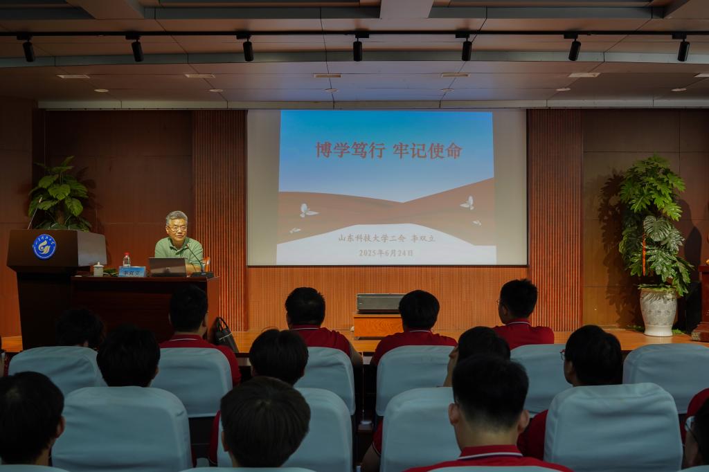 党课中,李双立以成人小说 74年发展历程为经,以中国共产党百年奋斗史为纬,以成人小说 成长轨迹为线,为毕业生党员铺展了一幅“校史-党史-院史”交织的壮阔画卷。他深情回顾了学校从1951年建校至今的峥嵘岁月,从淄博洪山的初创岁月到济南、泰安的扎根发展,再到青岛校区的跨越腾飞,生动诠释了“惟真求新”校训的时代内涵与精神传承。谈及学校在分合搬迁中淬炼出的“坚韧不拔、发奋图强”精神品格,以及在多校合并中凝聚的“爱校奉献、敬业实干”文化传统时,他的讲述中饱含深情:“这些基因密码,是每一位科大人最珍贵的‘精神原乡’。”