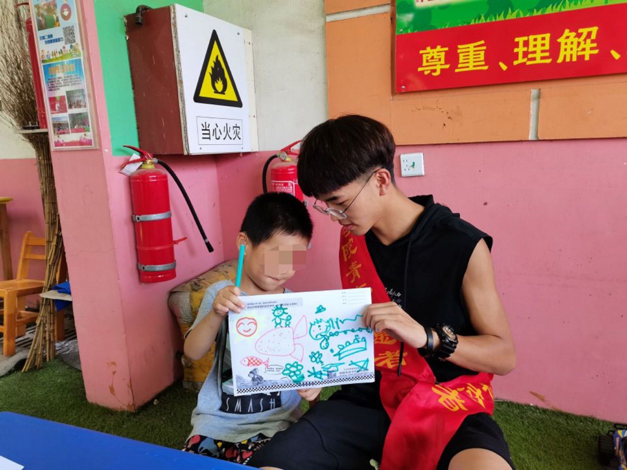 拜访期间,晨星特教暑期调研团队采访了语训中心的韩老师,对语训中心有了进一步的了解:在语训中心里,一部分是聋哑儿童,另一部分主要是自闭症儿童以及交流困难的儿童。调研团队在调研过程中发现儿童虽然语言交流不便,但非常愿意通过画画的方式表达自己的想法。特殊儿童有着不同于我们的表达方式,简单的涂鸦也在表达他们内心的想法,因此我们要通过涂鸦,发现并了解他们内心的想法。我们在和特殊儿童的交流中要多一些耐心,让他们在涂鸦的世界无拘无束、毫无障碍的表达自己。