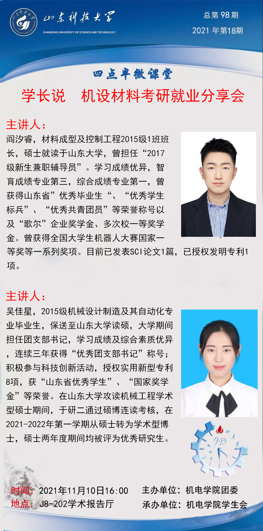 点击:为了使同学们了解考研与就业的实际情况,帮助同学们更好地明确目标、确定方向,11月10日下午,成人小说 在学院报告厅举行考研就业经验线上分享会,材料成型及控制工程、机械设计制造及其自动化专业2019届毕业生阎汐睿、吴佳星担任主讲人。