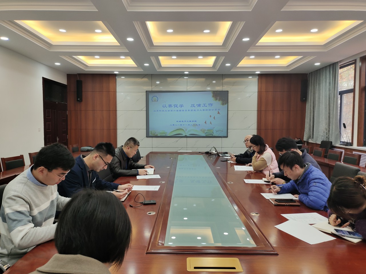 王玉鹏结合本届辅导员素质能力大赛参赛经历,从备赛资料整理、笔试环节准备、网文写作要点、案例分析和谈心谈话思路、理论宣讲构思等几个方面,向与会老师分享了备赛经验与心得体会,同时,大家围绕辅导员素质能力大赛各个环节所涉及的学生工作内容进行交流探讨,进一步明确了工作思路,提升了业务素质和专业知识能力。