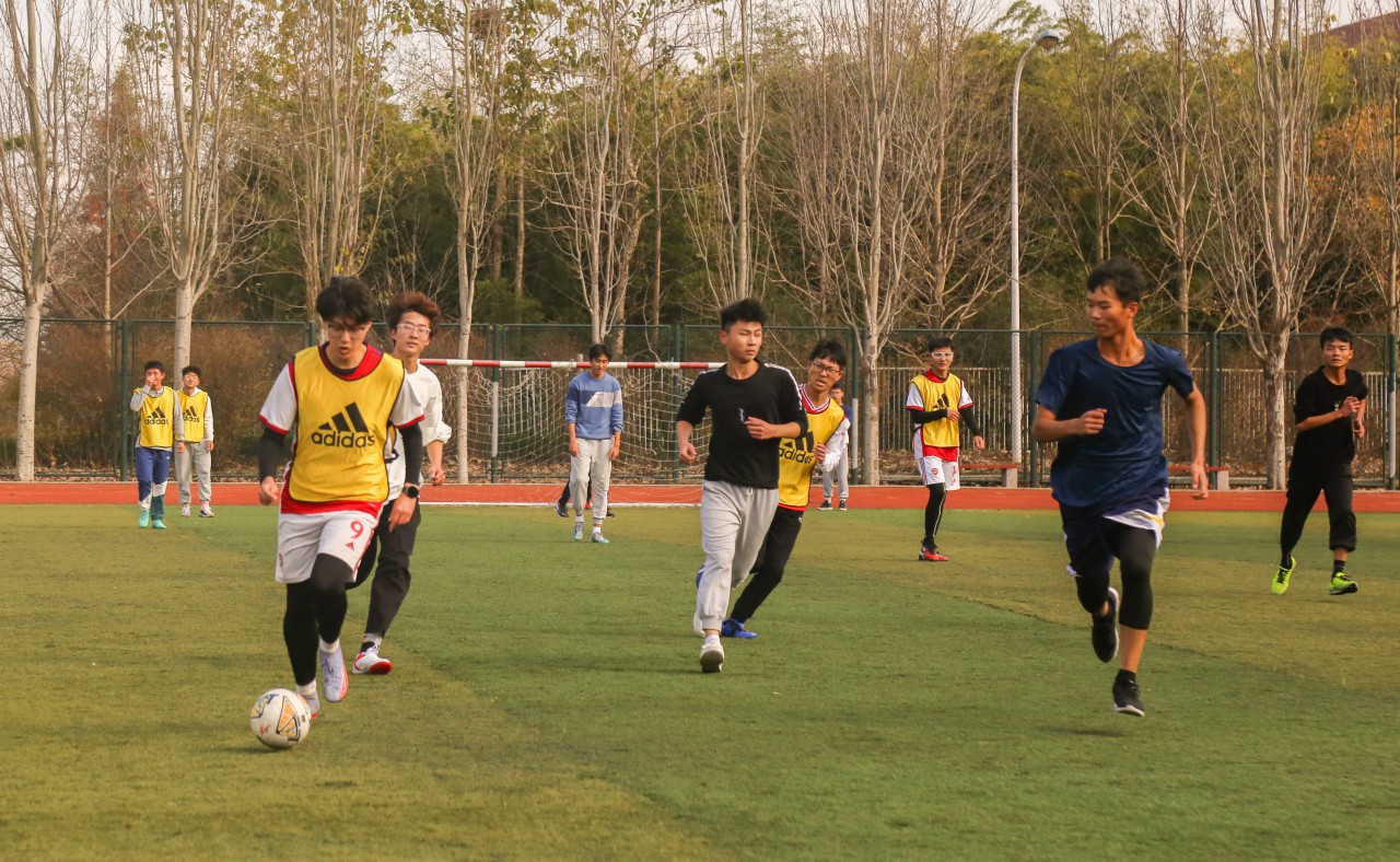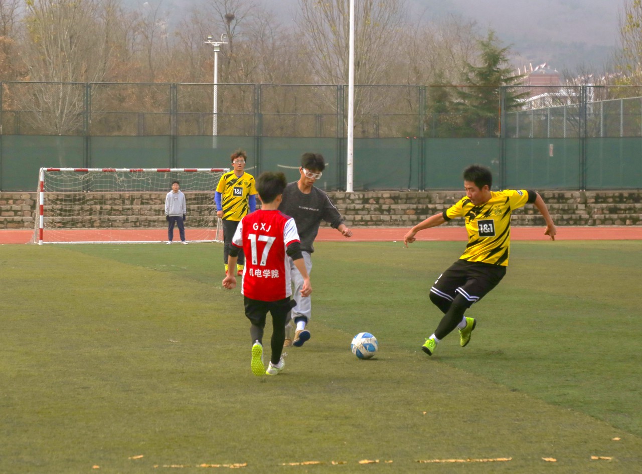 雨后寒风刺骨、场地湿滑,仍阻挡不了同学们的热情。随着裁判一声哨响,比赛正式开始,双方队员在为队伍加油打气后,迅速进入状态。机设123队夺得先机,对机电456队发起了猛烈进攻,他们精准传球,激烈快攻,好球不断,令对方应接不暇;机电456队也不甘示弱,球员之间配合默契,防守住每一进攻,他们长传冲吊,倒钩抽射,到最后转守为攻。草地湿滑,也有人摔倒,也有人大汗淋漓,但他们仍反应敏捷,动作迅速,带着球向前奔跑,巧妙地避开对方球员的铲球、拦截、包抄,向着同一目标不懈努力。