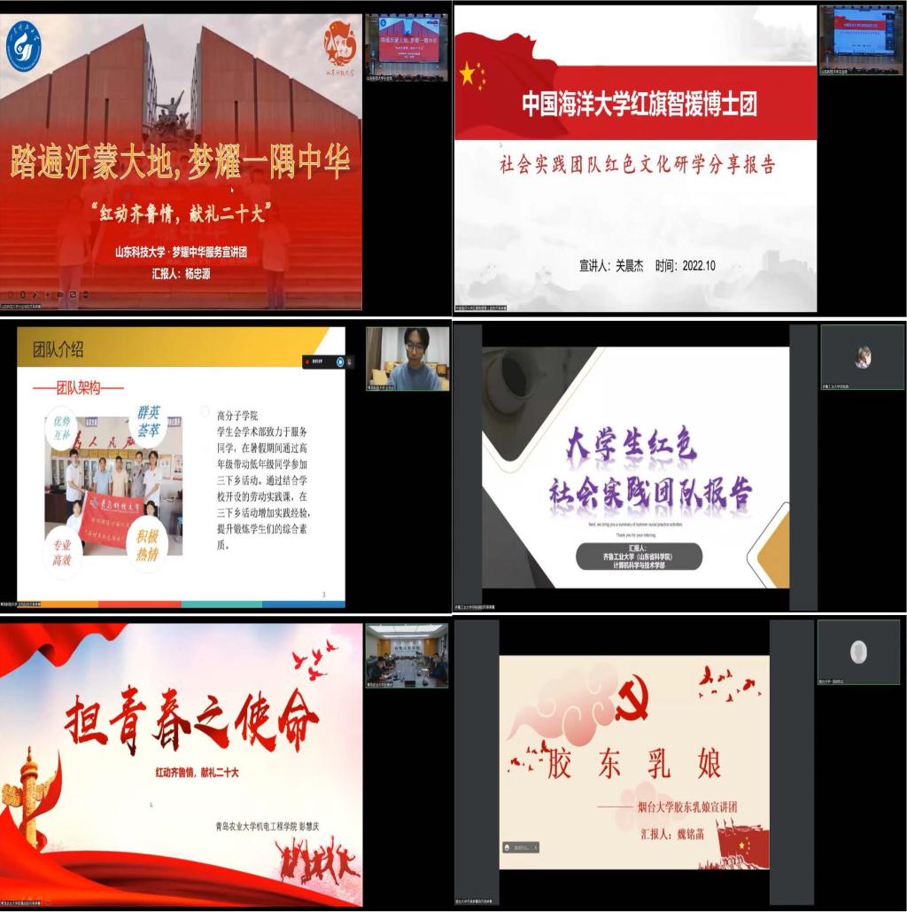 在党的二十大即将召开之际,为弘扬齐鲁红色文化,传承山东红色基因,深化驻鲁高校大学生红色实践团队研学活动,10月10日,“红动齐鲁情,献礼二十大”——驻鲁高校大学生红色社会实践团队联学共建活动在成人小说 举行。来自成人小说 、中国海洋大学、青岛科技大学、齐鲁工业大学、青岛农业大学、烟台大学六所高校社会实践团队相关学院团委书记、指导老师、团队成员代表线上线下参与活动。成人小说 团委书记尹立明、研究生工作部副部长刘松、学生工作部副部长靳凯、成人小说 党委副书记陈猛出席启动仪式。本次活动由成人小说 成人小说 团委书记樊玉华主持。