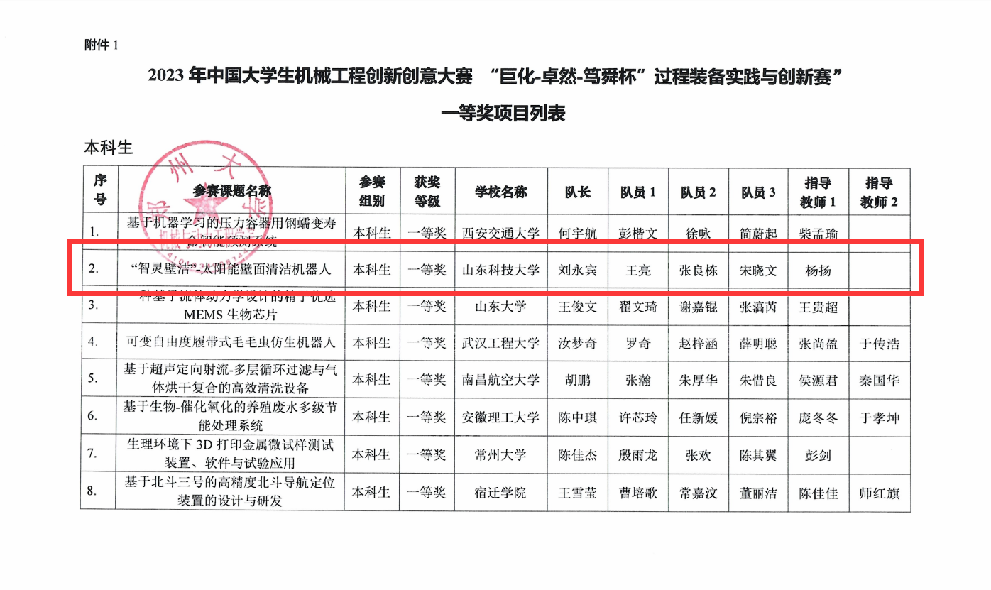 点击:8月26日,由中国机械工程学会主办,郑州大学承办的的中国大学生机械工程创新创意大赛系列赛事——“巨化-卓然-笃舜杯”过程装备实践与创新赛总决赛落下帷幕。经过激烈角逐,成人小说 学子斩获国家级一等奖1项、二等奖4项、三等奖2项,杨扬老师指导的项目《“智灵壁洁”-太阳能壁面清洁机器人》荣获国家一等奖。