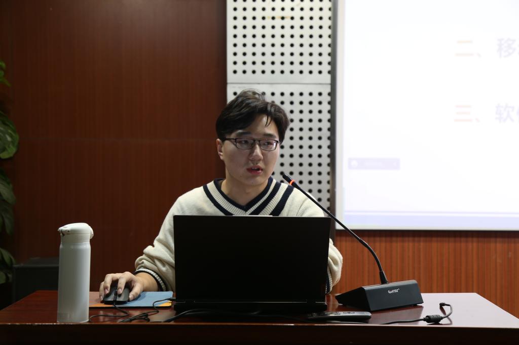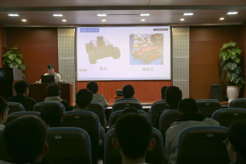 会议伊始,甘兆露展示了自己三年来众多科技成果、获奖证书以及各种荣誉称号,其名列前茅的学业成绩以及推免至浙江大学攻读硕士研究生的经历都让学生们赞叹不已。接下来,甘兆露围绕着竞赛类别、移动机器人所需的相关技术以及相应软件等三个方面展开宣讲。他对机器主流定位的方式、有刷电机和无刷电机的区别、视觉传感从何学起等进行了全方面、多层次地讲解,学生们全神贯注地倾听。讲解结束,学生们结合自身情况,踊跃地向甘兆露学长提出问题,甘兆露一一细心解答。甘兆露强调:“知识是无限的,想要快速成长,就要有针对性,去找团队,去参加比赛,只要认真学习,找对方向,不怕不会,勇敢去闯。”